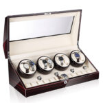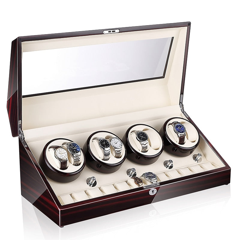 This solid wood watch winder for automatic watchesis a high quality product to protect your luxury watches.This beautiful watch boxis ideal for your luxury watch collection thanks to its4 rotors. each of which can hold 2 automatic watches. and 2 storage options for mechanical watches on either side of the screen.
