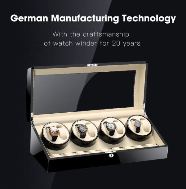 This solid wood watch winder for automatic watchesis a high quality product to protect your luxury watches.This beautiful watch boxis ideal for your luxury watch collection thanks to its4 rotors. each of which can hold 4×2 automatic watches. and9 storage options for mechanical watches on either side of the screen.