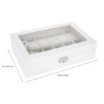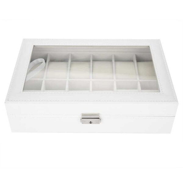 Its exterior is made of wood covered with a pretty white faux leather. This gives it a very simple and classic look. complemented by a stainless steel closure system and a glass top. The interior is lined with soft felt to take care of your watches.