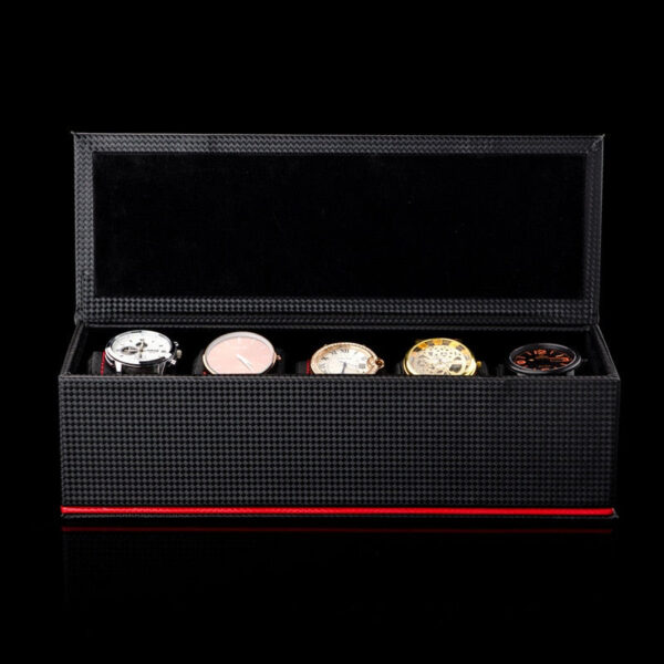 Sublime watch box that can hold up to 5 watches. A 100% black look faux leather interior and exterior. A light. subtle splash of color has been added with the red topstitching that runs around the box. This is the perfect box for a man looking for a chic. practical and quality storage option. The black color will add even more elegance to your watches. It also serves as a good protection from shocks. Another advantage of this box is that it is suitable for all your watches. It will also be a very nice gift for a loved one.