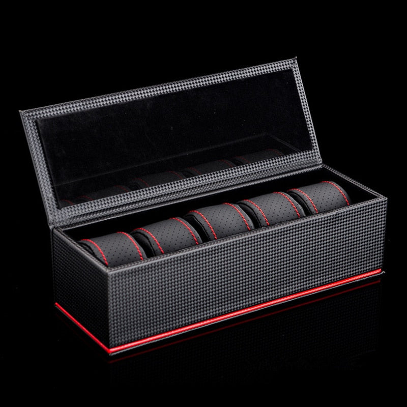 Sublime watch box that can hold up to 5 watches. A 100% black look faux leather interior and exterior. A light. subtle splash of color has been added with the red topstitching that runs around the box. This is the perfect box for a man looking for a chic. practical and quality storage option. The black color will add even more elegance to your watches. It also serves as a good protection from shocks. Another advantage of this box is that it is suitable for all your watches. It will also be a very nice gift for a loved one.