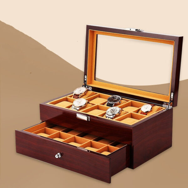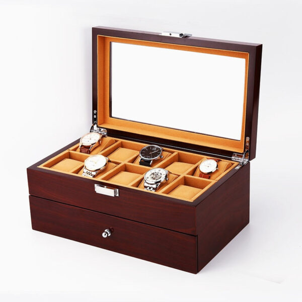 This watch box is made of high quality wooden material. which makes it very durable. Inside. a layer of soft velvet has been applied. This layer is very comfortable and guarantees the best protection for your watches. offering a beautiful contrast and luxurious look. In order for you to admire your watches well. there is a viewing window in the lid.
