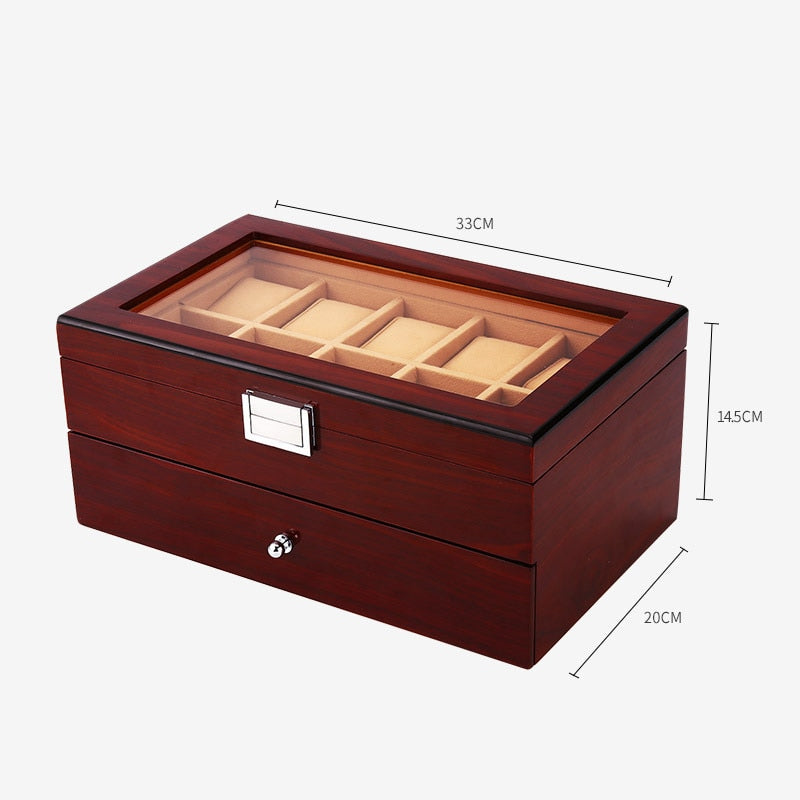 This watch box is made of high quality wooden material. which makes it very durable. Inside. a layer of soft velvet has been applied. This layer is very comfortable and guarantees the best protection for your watches. offering a beautiful contrast and luxurious look. In order for you to admire your watches well. there is a viewing window in the lid.