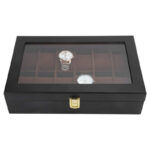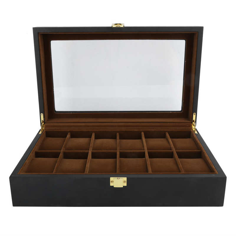 This matte black wooden watch box with a faux suede interior will protect your watches from dust.