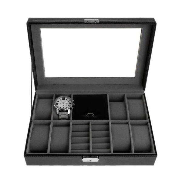 Opt for a modern style with our Watch Box Black. which consists of 8 places and is ideal if you have a watch collection of about ten pieces. The contemporary leather design will show off your finest watches while making the box a unique decorative piece. The upper part of the box allows you to see your collection at a glance. The inside of the box is lined with soft felt to protect your jewelry from scratches and friction.
