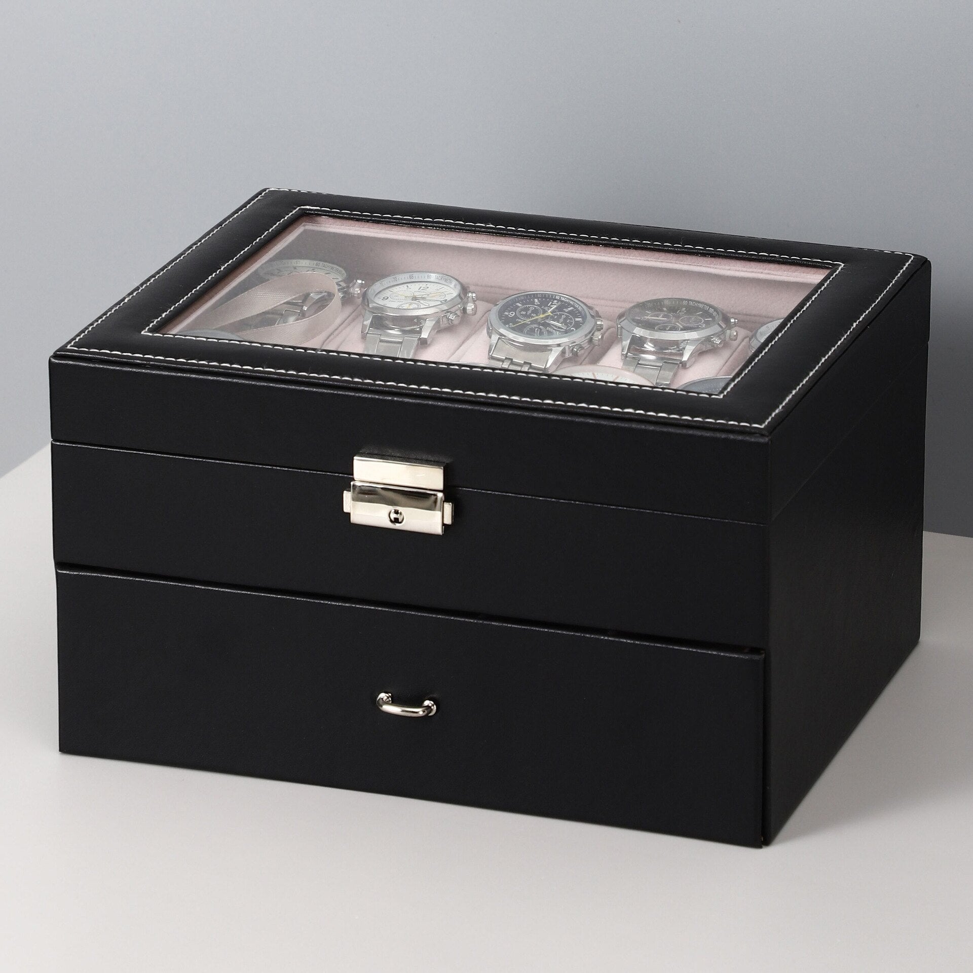 Use this faux leather and wood watch box to store your finest timepieces. and easily position it on a nightstand or dresser. With removable watch cushions. the box also has a glass window in the lid so you can better view your beautiful collection.