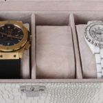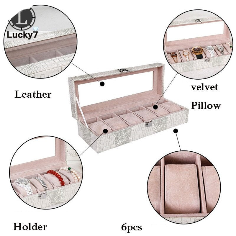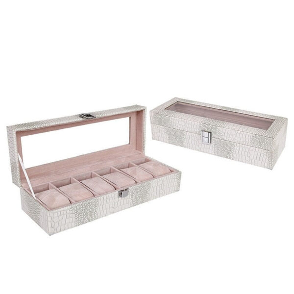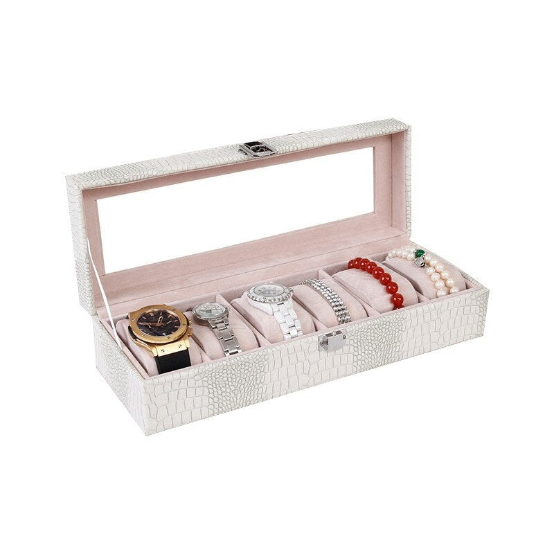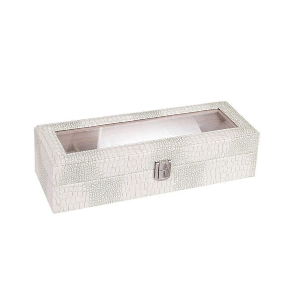 Composed of 6 individual compartments. this box is the perfect accessory for women looking for an elegant. original and quality storage option for their watches. Its exterior is made of wood covered with a pretty white faux leather. complemented by a stainless steel closure system and a glass top. The interior is lined with soft felt to keep your watches safe.