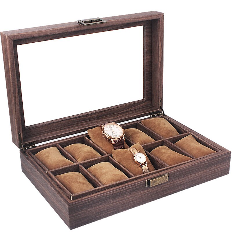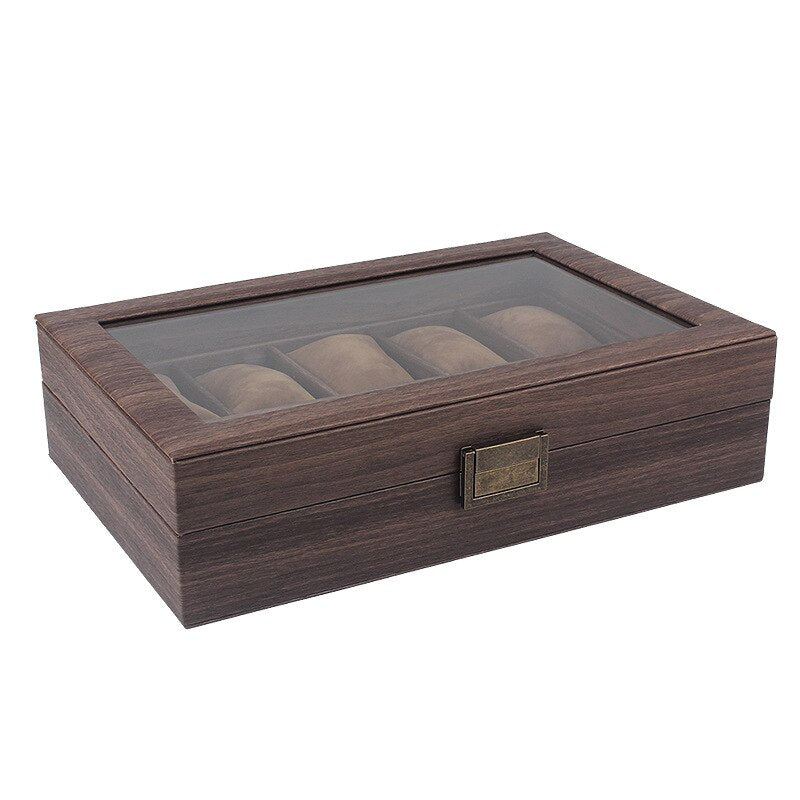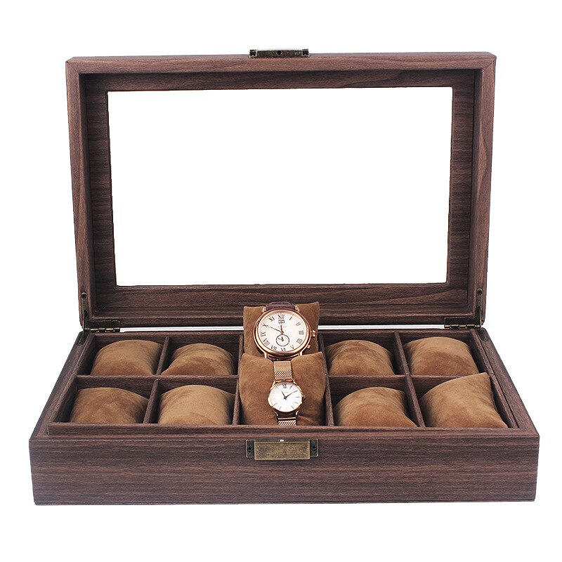 This solidwood watch boxin brown with a faux suede interior in two colors is perfect for storing your watches