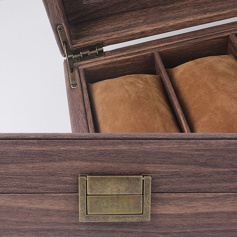 Thiselegant boxis therefore suitable for any interior. The outer surface is made of veryhigh quality wood. which is also sturdy and pleasant to the touch. The entire interior is lined with a soft velvet fabric. This prevents your watches from getting scratches or dents. Close the lid completely toprotect your valuable watchesfrom dust and discoloration.