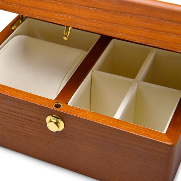 A beautiful watch box made of high quality wood that looks as elegant from the outside as it does from the inside. It is the perfect storage option for anyone who wants to keep their watch. jewelry and other accessories safe. The soft. fleece-lined interior consists of a large single compartment for a watch and four small slots for cufflinks. rings. earrings and other accessories.