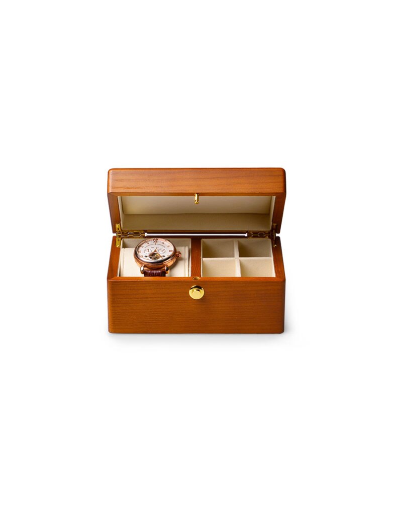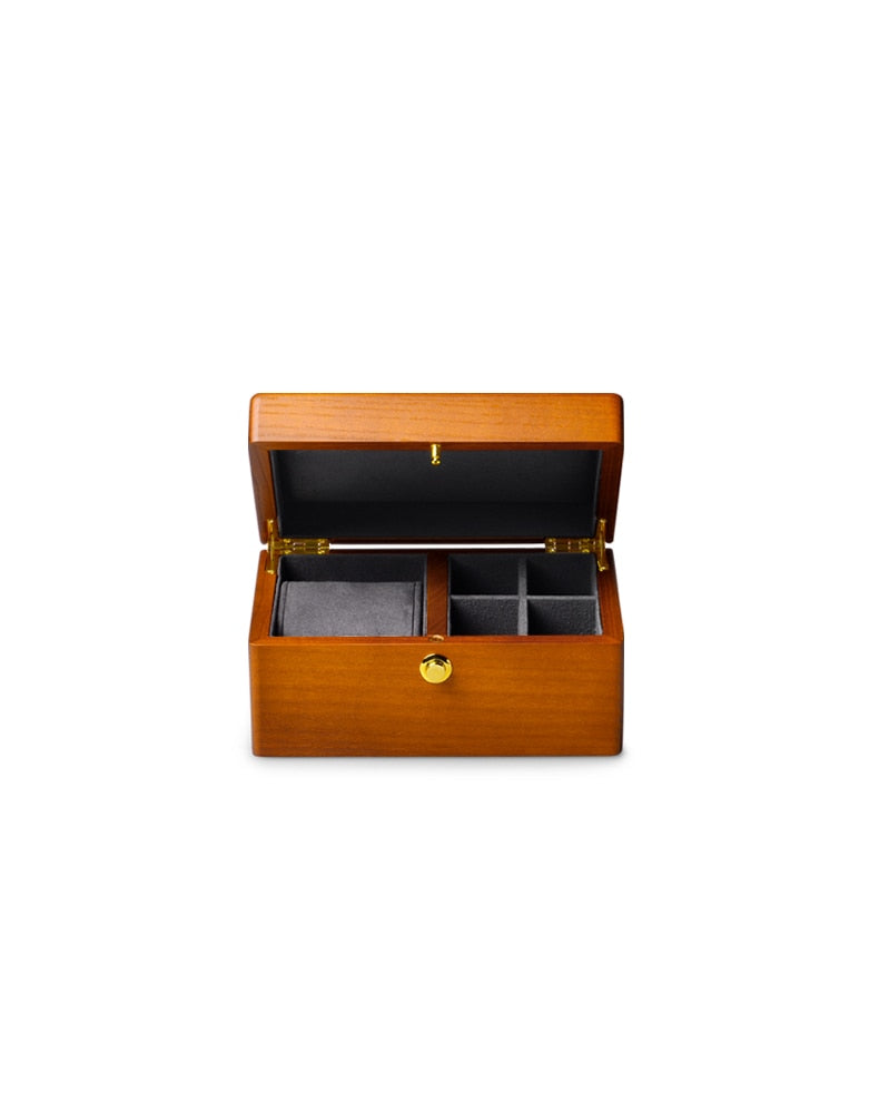A beautiful watch box made of high quality wood that looks as elegant from the outside as it does from the inside. It is the perfect storage option for anyone who wants to keep their watch. jewelry and other accessories safe. The soft. fleece-lined interior consists of a large single compartment for a watch and four small slots for cufflinks. rings. earrings and other accessories.