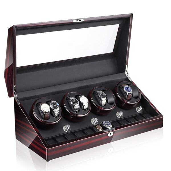 This solid wood watch winder for automatic watchesis a high quality product to protect your luxury watches.This beautiful watch boxis ideal for your luxury watch collection thanks to its4 rotors. each of which can hold 2 automatic watches. and 2 storage options for mechanical watches on either side of the screen.